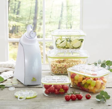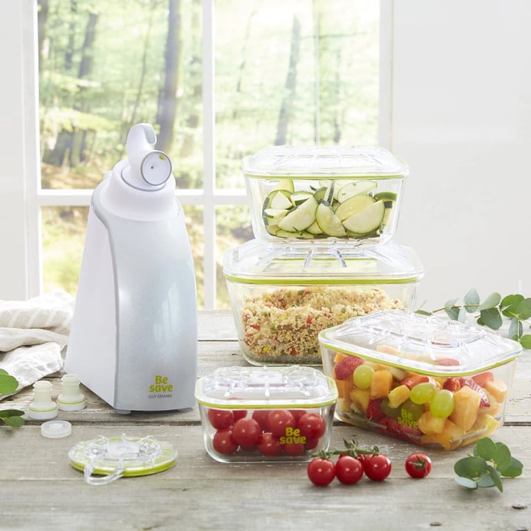 Be Save est le système de mise sous vide qui change la façon de conserver les aliments. En retirant l’air des boîtes et des sacs spécifiques, il prolonge la durée de conservation de 2 à 5 fois plus longtemps. Résultat : des aliments toujours frais, des vitamines préservées et moins de gaspillage alimentaire.